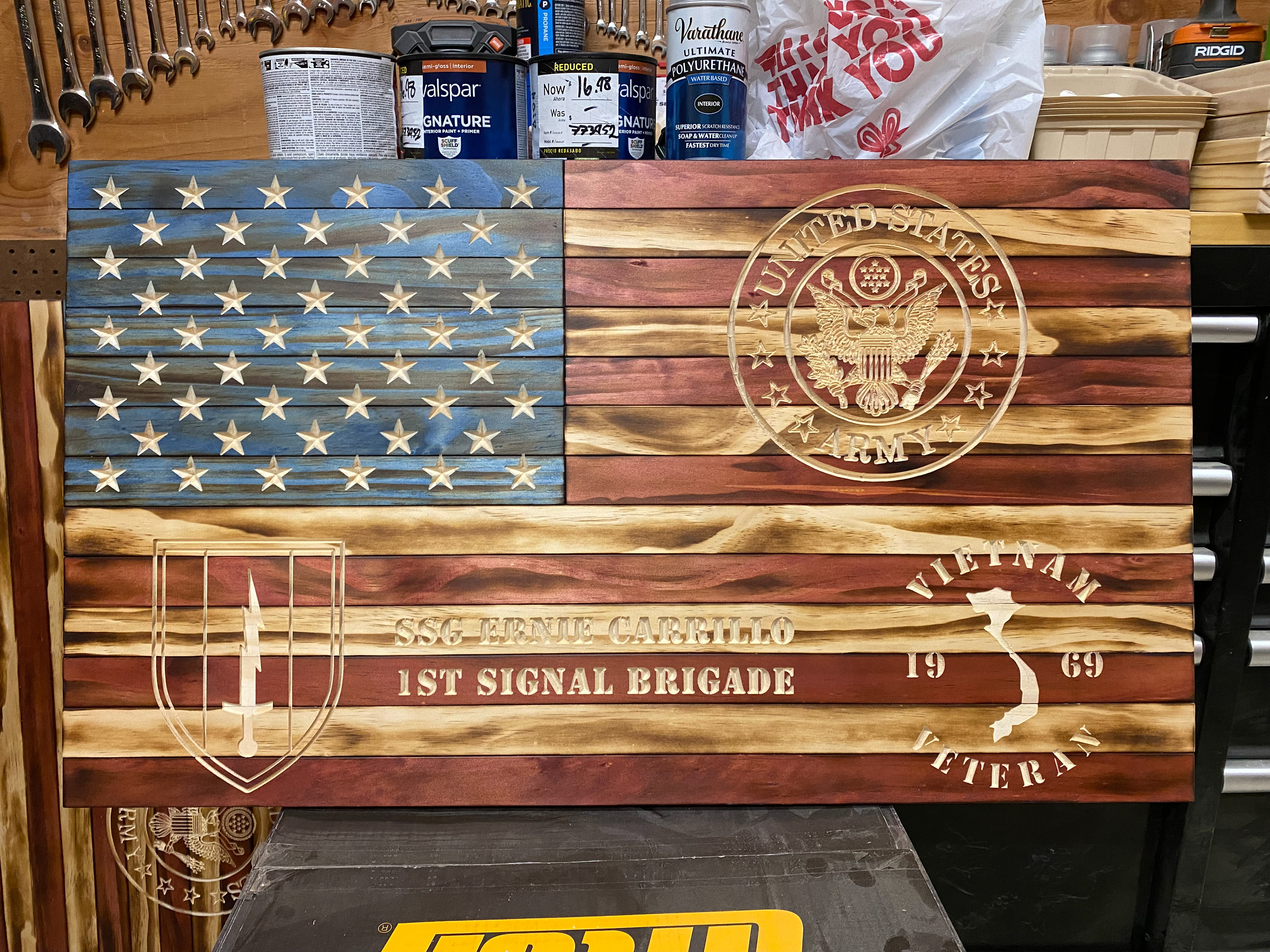Made out of 3/4" Select Prime Pine, stained and sealed with a satin poly finish. Price increases for exotic woods and complex engraving.