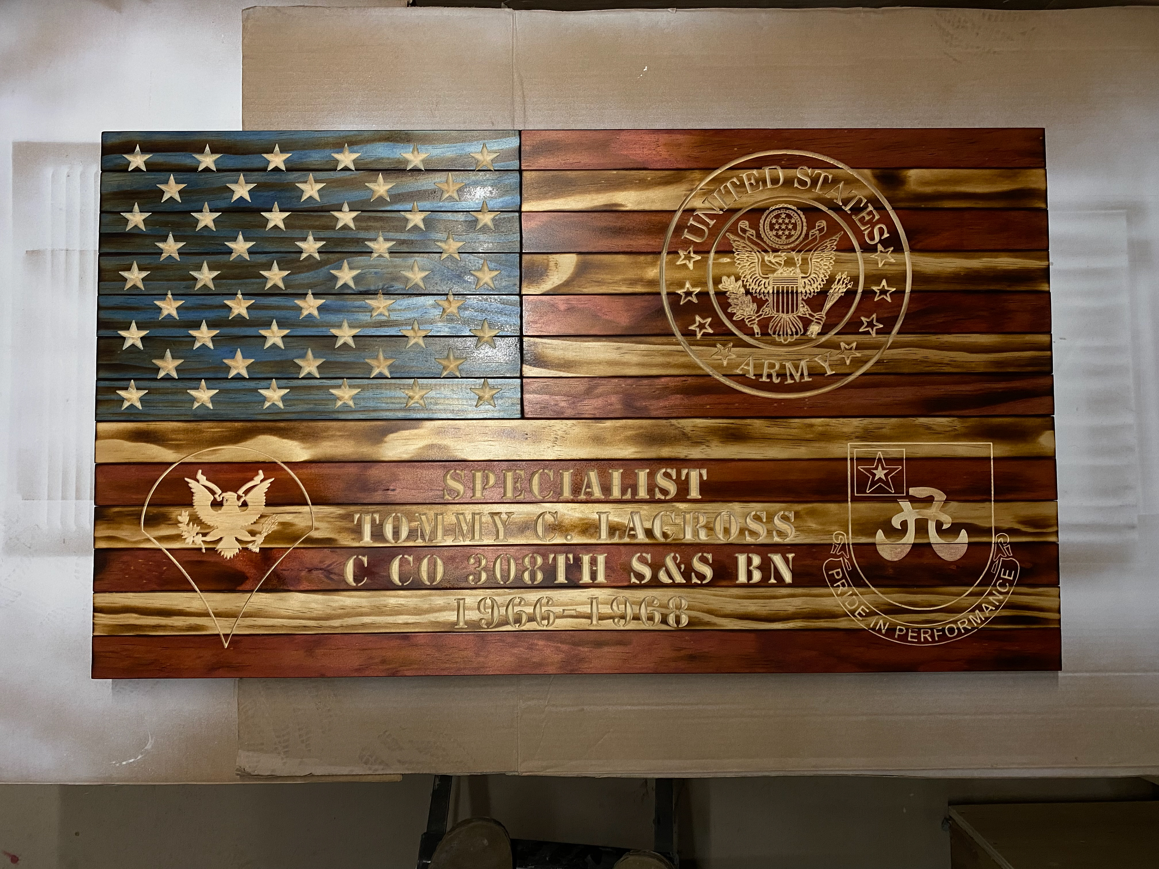 made from select pine, stained and engraved